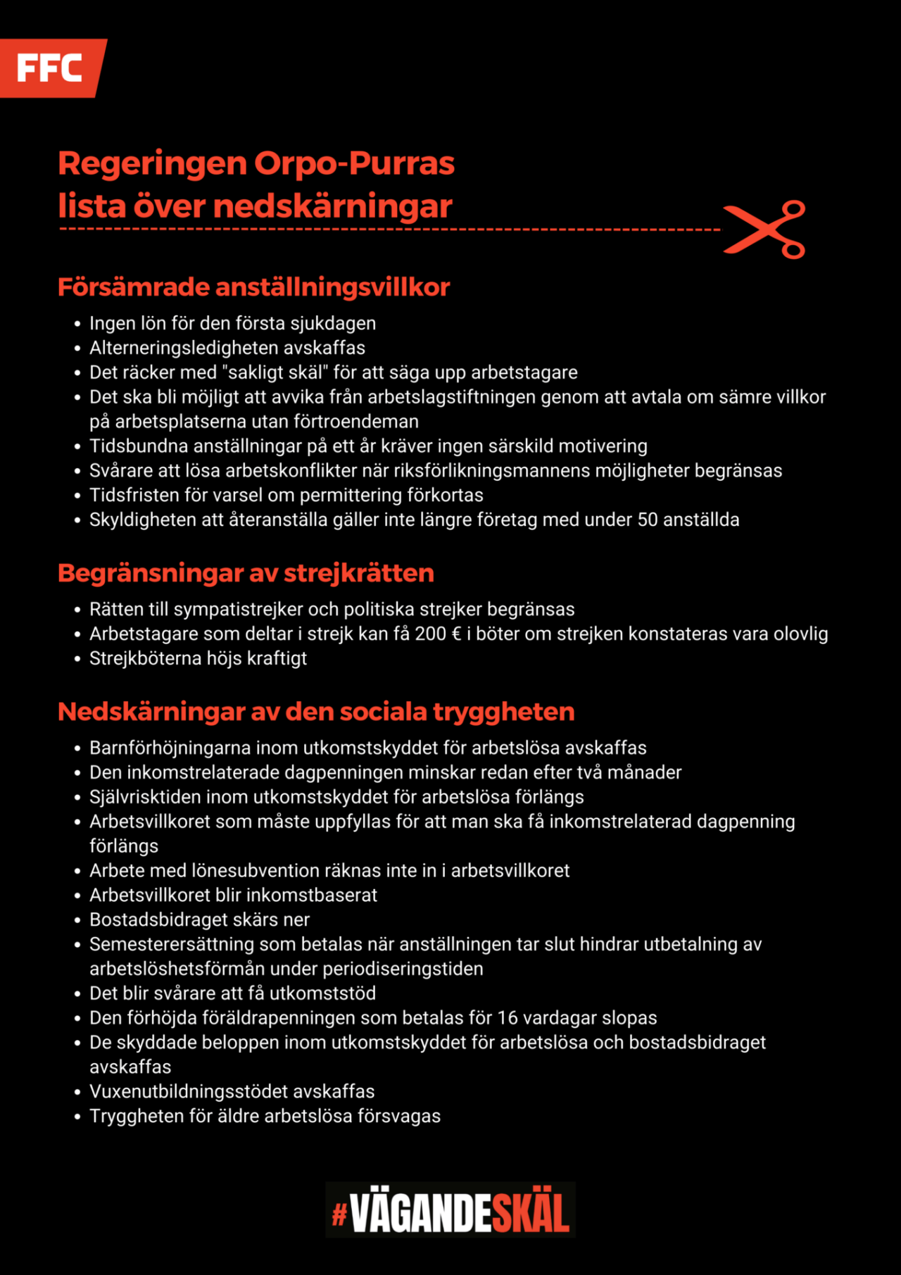 #VägandeSkäl är FFC:s och fackförbundens kampanj, vars mål är att motverka statsminister Petteri Orpos regerings förslag, som försvagar arbetstagarnas strejkrätt, arbetsvillkor och arbetslöshetsskydd. Eftersom regeringen inte lyssnar till oss är vi tvungna att försvara arbetstagarnas rättigheter med politiska strejker.