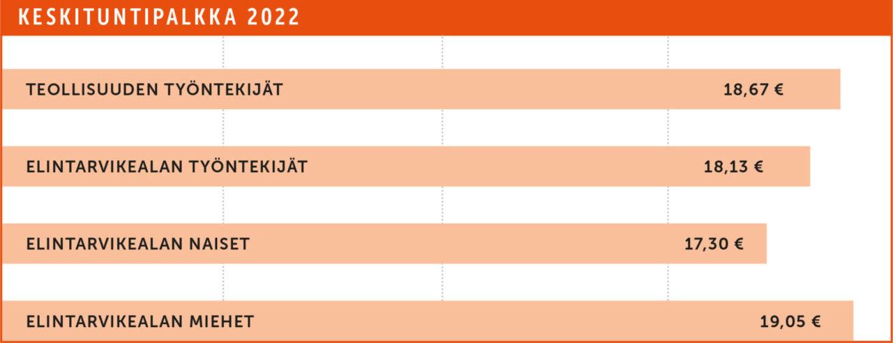 Elintarvikealan työntekijä tienasi vuonna 2022 keskimäärin 18,13 euroa tunnissa. Elintarvikealan palkat nousivat 2,2 prosenttia, kun muussa teollisuudessa palkat nousivat 2,4 prosenttia.