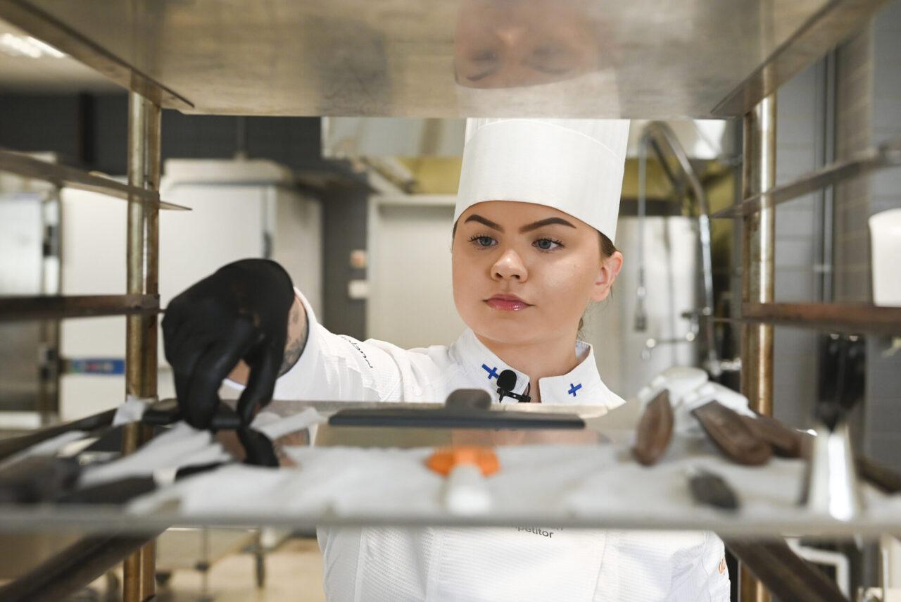 Saimaan ammattiopisto Sampon konditorialuokassa Lappeenrannassa on keskittynyt tunnelma, kun Ukkonen harjoittelee Markku Vengasahon ja Outi Suopangin ohjauksessa. Ukkonen tekee, opettajat neuvovat, ohjaavat, kannustavat – ja kehottavat välillä hieman korjaamaan tuotetta tai tekniikkaa.