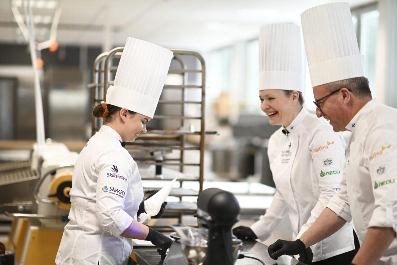 – Tulossa on ainakin taitotyö, jälkiruoka, kakku ja todennäköisesti marsipaanimuotoilua tai konvehteja. Jotain yllätysraaka-aineitakin tulee, mutta muuten kaikki suunnitellaan etukäteen. Läpivientitreeneissä kilpailutöitä harjoitellaan yli kymmenen kertaa, Suopanki kertoo.