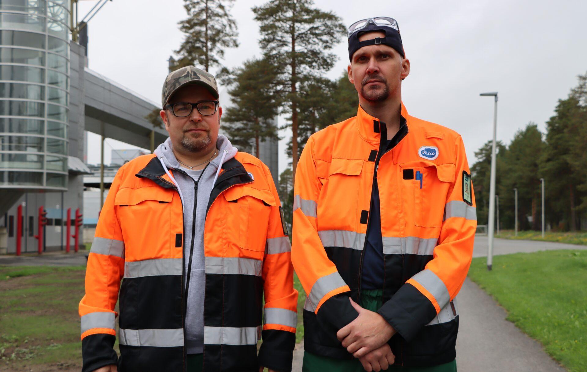 Kuvassa ovat Sami Erkkilä ja Harri Lantto, jotka tekivät monta vuotta tiiviisti työparina töitä Valion Oulun tehtaan työntekijöiden työsuojeluvaltuutettuna ja pääluottamusmiehenä. Kuva on syyskuulta 2025.