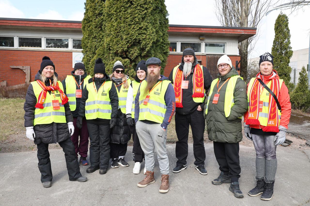 Kuvassa: Emma Äimänen ja muut Apetitin Säkylän tehtaan lakkovahdit huhtikuussa.